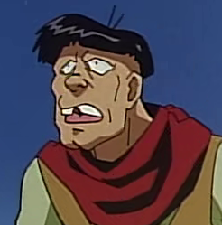 A tall man with short, pointy black hair and a faint mustache. He wears a dark brown vest over a light green-yellow shirt, gray pants, and tan shoes. He wears a red bandana around his neck.