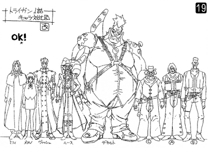 • Descartes is the only member of the gang to actually appear in the manga continuity. He is featured prominently in Trigun Maximum Volume 2, Chapter 1.