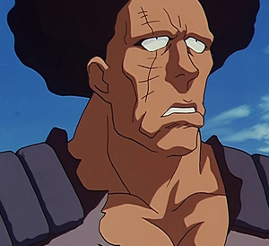 A very tall and muscular man with a black afro and scar on the left side of his face, crossing over his eye.