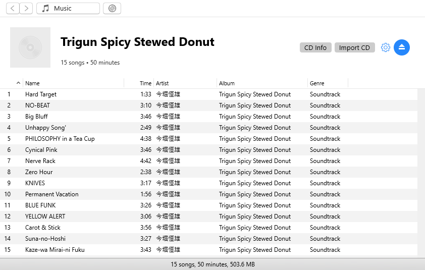 Metadata for the Trigun: Spicy Stewed Donut CD fetched by iTunes from Gracenote on 6/2/2023.