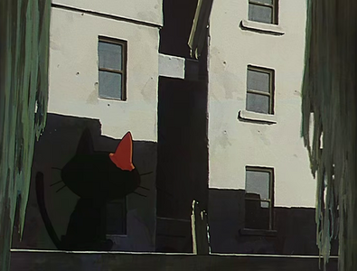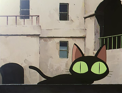 At 22:27, Kuroneko was napping on the windowsill of the same building during the day when Vash and Wolfwood were ambushed by the group of children. She meowed, but didn't open her eyes, despite the racket.