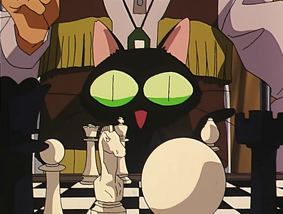Starting at 01:56, Kuroneko played a significant role in this scene. She was sitting in the lap of the man Wolfwood was playing chess against in the caravan's Bob Saloon and meowed at Wolfwood as he struggled to figure out his next move in the game.