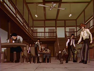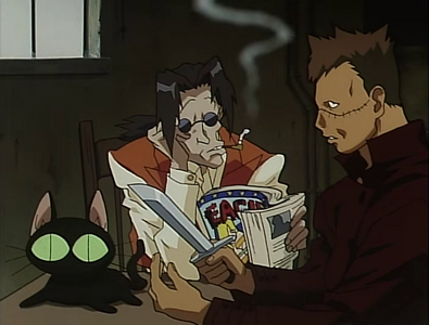 At 09:04, Kuroneko was on the table in the restaurant, eating off of Vash's plate where he had been sitting a moment earlier, across from Wolfwood. Wolfwood continued speaking to Kuroneko as if he were Vash, saying "I always had my suspiciions you were no mere mortal, but I had no idea you were actually a cat." before realizing that Vash had actually left the restaurant without him noticing.