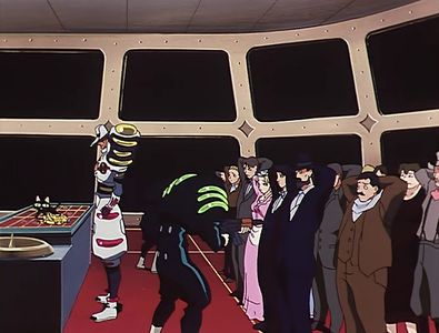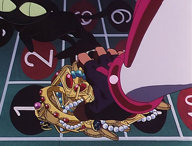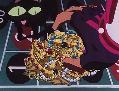 At 14:00, Kuroneko was standing on a roulette table beside the small pile of coins, jewelry, and other valuables stolen by the Bad Lads from the passengers being held hostage. She meowed and ran away when Neon reached out to grab a handful of items from the pile.
