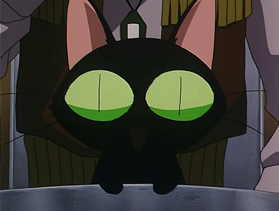 At 03:05, Kuroneko and a smaller, brown-furred Kuroneko were under the bed, eating Vash's sandwich that Milly had slipped a tracking device in. The two Kuronekos turned around and meowed when they noticed Milly and Meryl looking at them. Milly exclaimed that "Vash changed into a cat this time!"