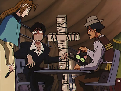 Wolfwood called out to Milly when he noticed her in the saloon and she came over to their table to talk with him. When she told Wolfwood she was traveling with Meryl and Vash, the man asked her in shock if Vash the Stampede really was there. While he was distracted by talking to Milly, Wolfwood tried to sneakily move his opponent's knight. However, Kuroneko meowed and smacked Wolfwood's hand with her claws.