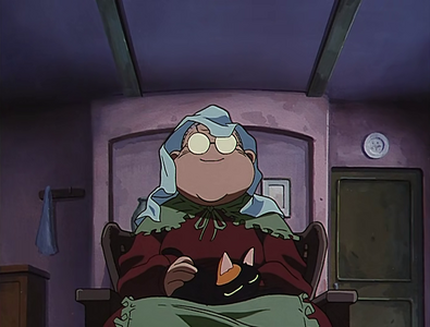 At 20:29, Kuroneko was asleep in Grandma Sheryl's lap while she spoke to Wolfwood.