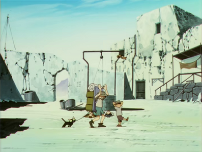 At 02:49, Kuroneko was being dragged on a leash behind the father and child duo who was leaving the town because of the water drying up and the rumor that Vash the Stampede had shown up as a hired gun at Mr. Cliff's mansion. She meowed angrily when the leash tugged her forward.