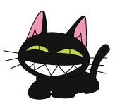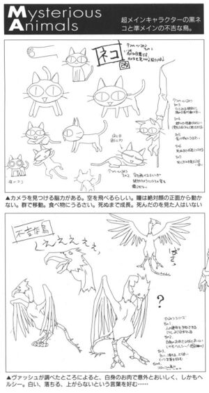 The SUPER main character, Kuroneko (black cat)[...]. Has the power to locate the camera. Appears to have the ability to fly. Eyes absolutely always face forward. Travels in packs. Eats very loudly. Continues to grow until death. No one has ever witnessed the death [of one of these creatures]. [3]