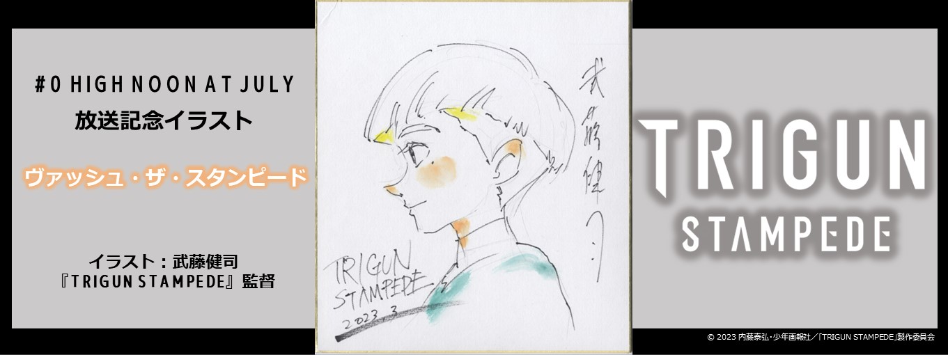 Revision as of 21:53, 20 July 2023 by KJNanika (talk | contribs) (Commemorative illustration for Trigun Stampede Episode 00's broadcast, featuring Vash the Stampede Illust. by Director Kenji Muto Source: https://twitter.com/trigun_anime/status/1639634638560968707)