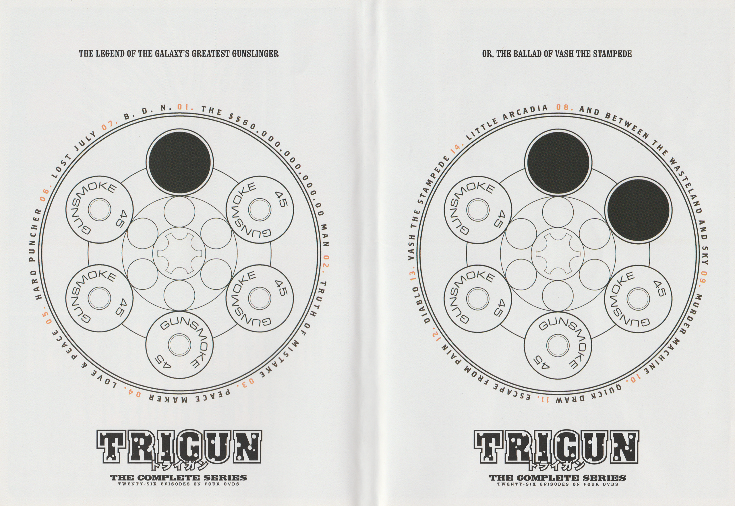 Interior of the first DVD case sleeve from the 2010 FUNimation Trigun - The Complete Series DVD release.