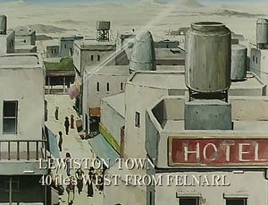 Lewiston is shown to be a fairly active town with people of all ages in the streets, talking with each other, at vendor stalls and storefronts, driving thomas carts, and playing with pets. It is 40 iles west of Felnarl Town.